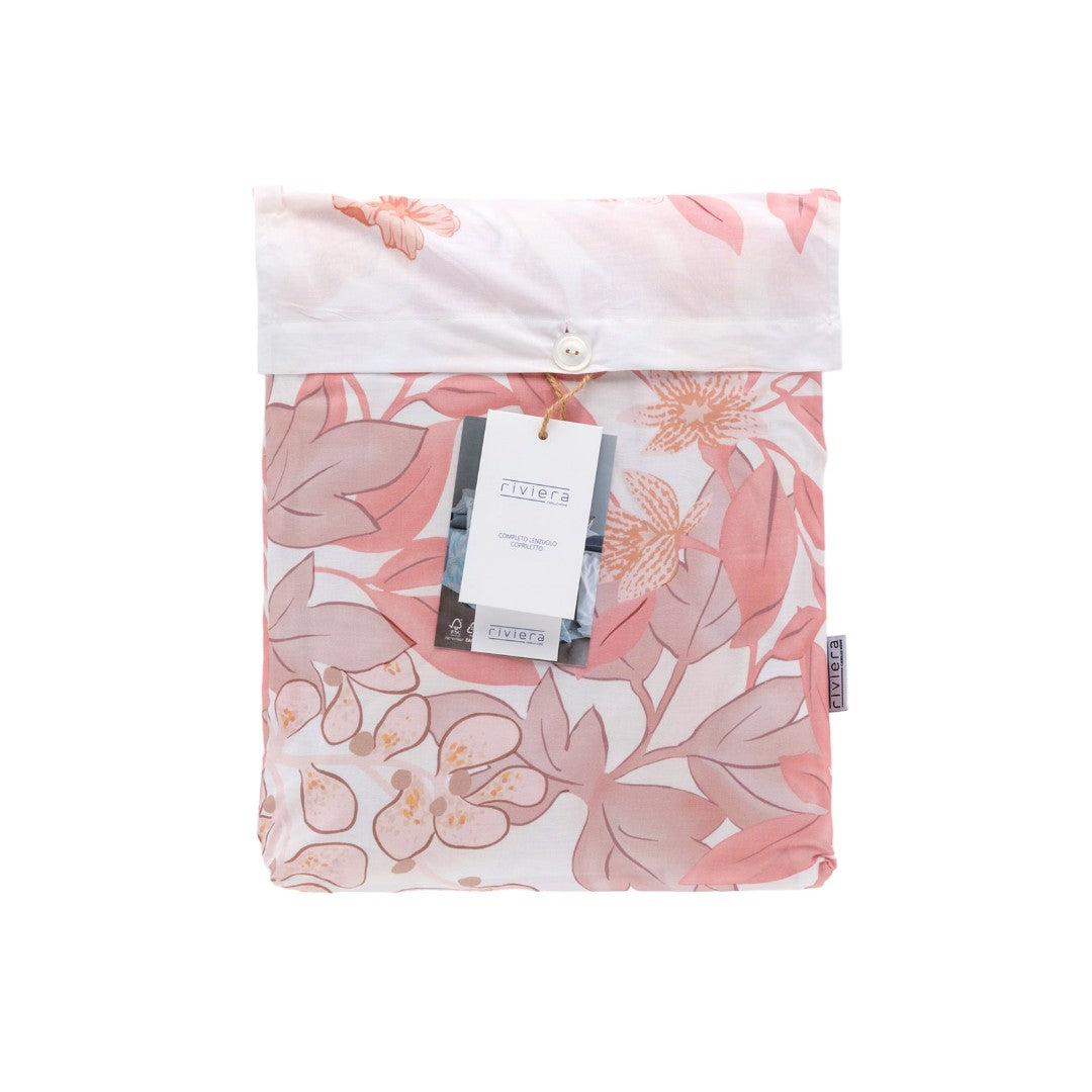 The package contains: top sheet and flounce in 100% cotton percale - digitally printed, bottom sheet with corners in 100% cotton percale - solid color and two double pillowcases. Matching quilt available.